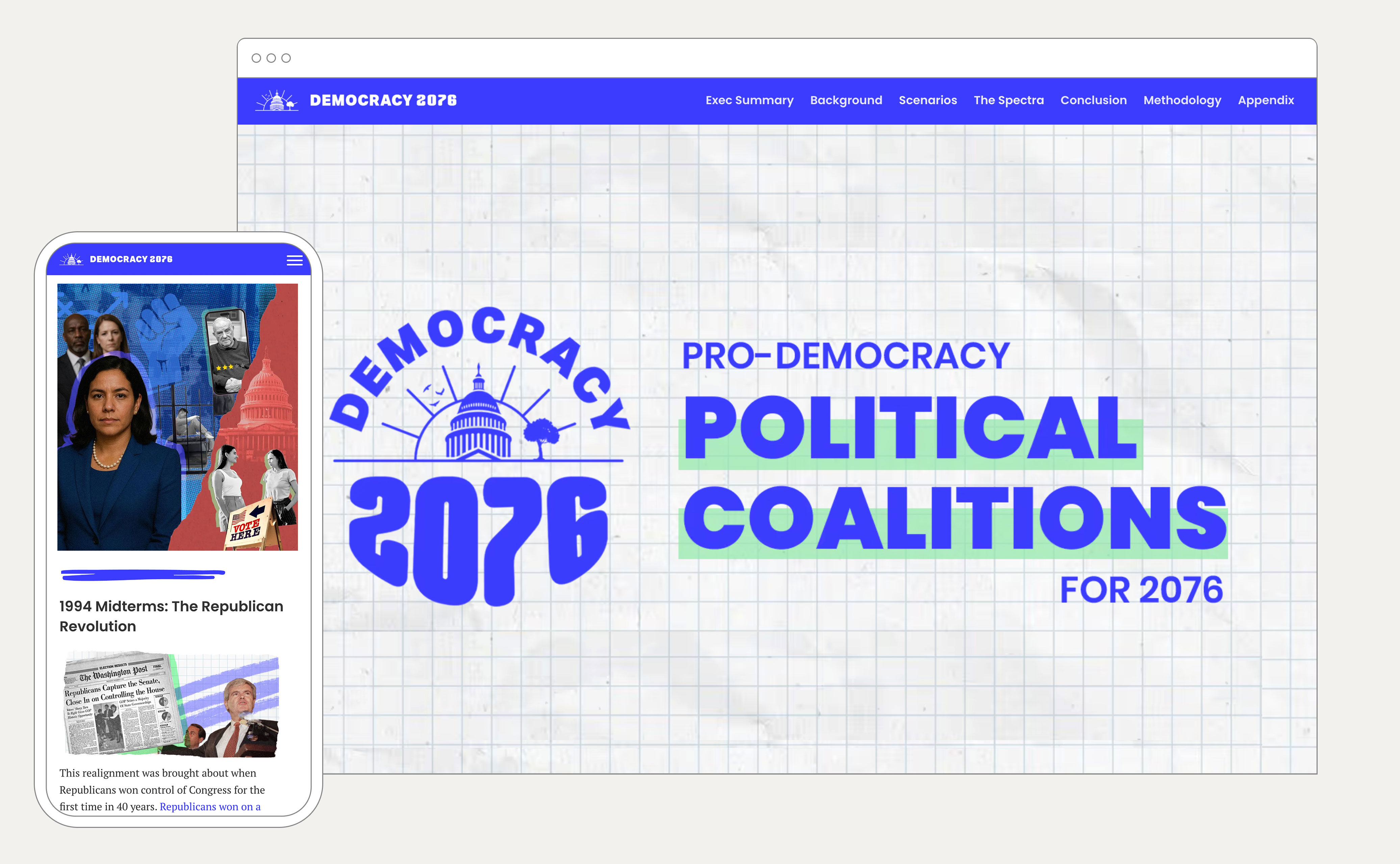 Democracy 2076 needed to communicate in depth research on future political realignments to a fragmented field: funders, organizers, researchers, and policymakers. The challenge was creating a digital report that felt grounded and engaging rather than abstract.